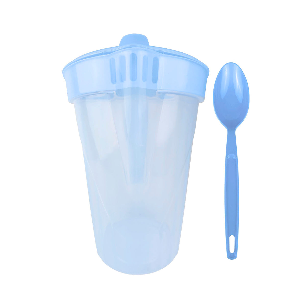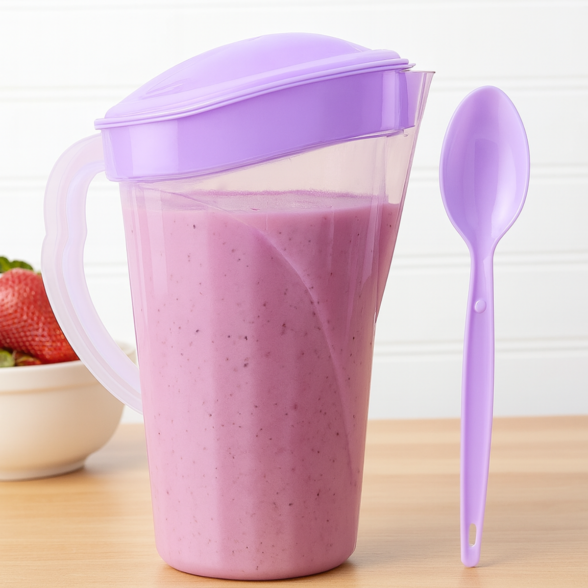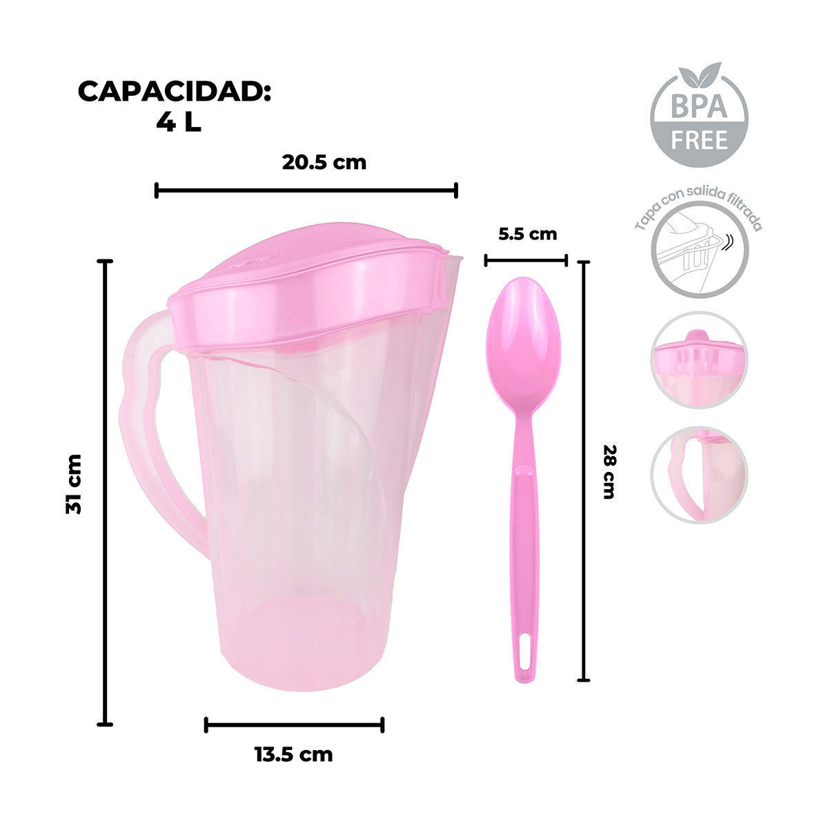 Hermosa jarra para tus bebidas más frescas acompañadas de 1 cuchara de plástico para que tengas el duo perfecto.