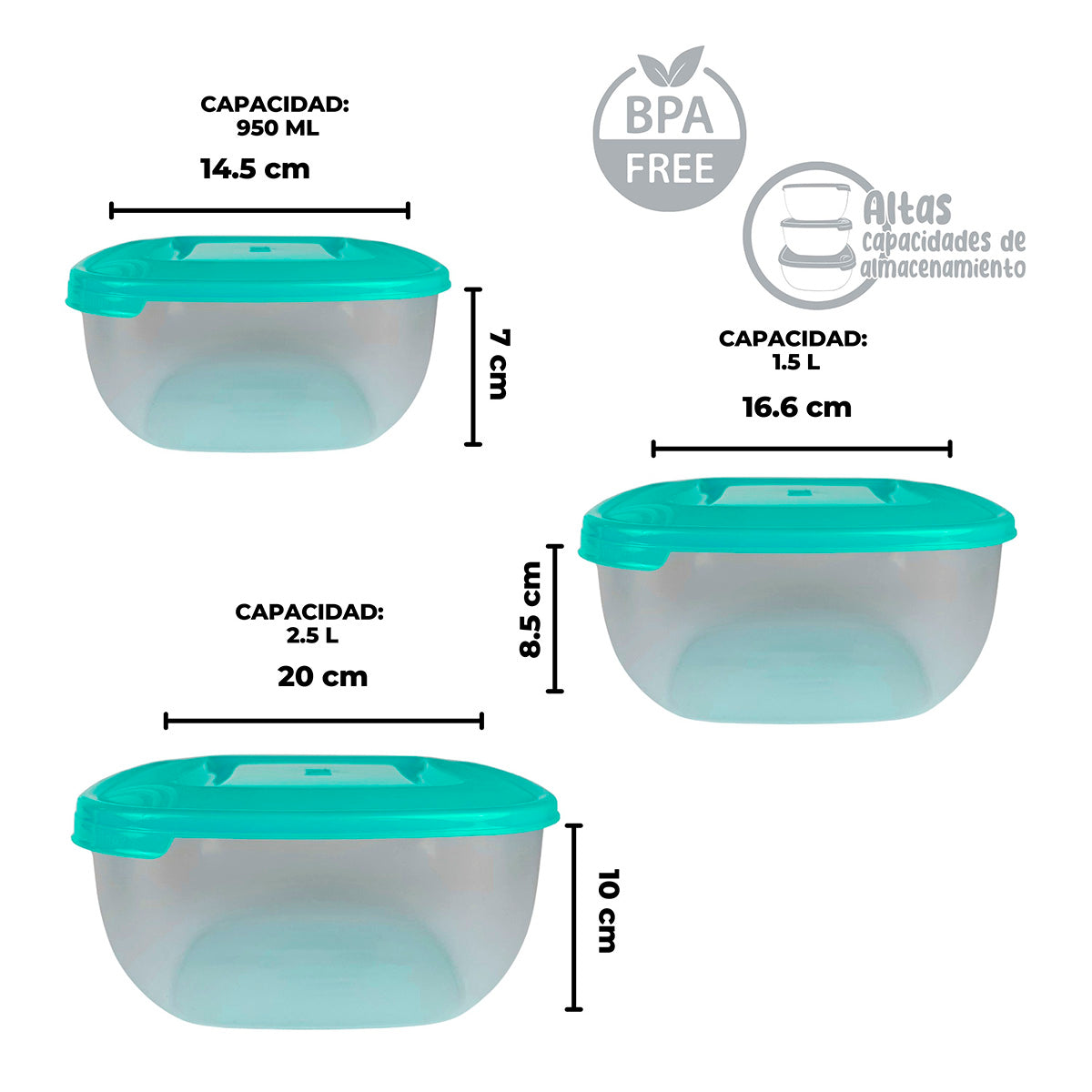 Capacidad: 950 ml, 1.5 L y 2.5 L.